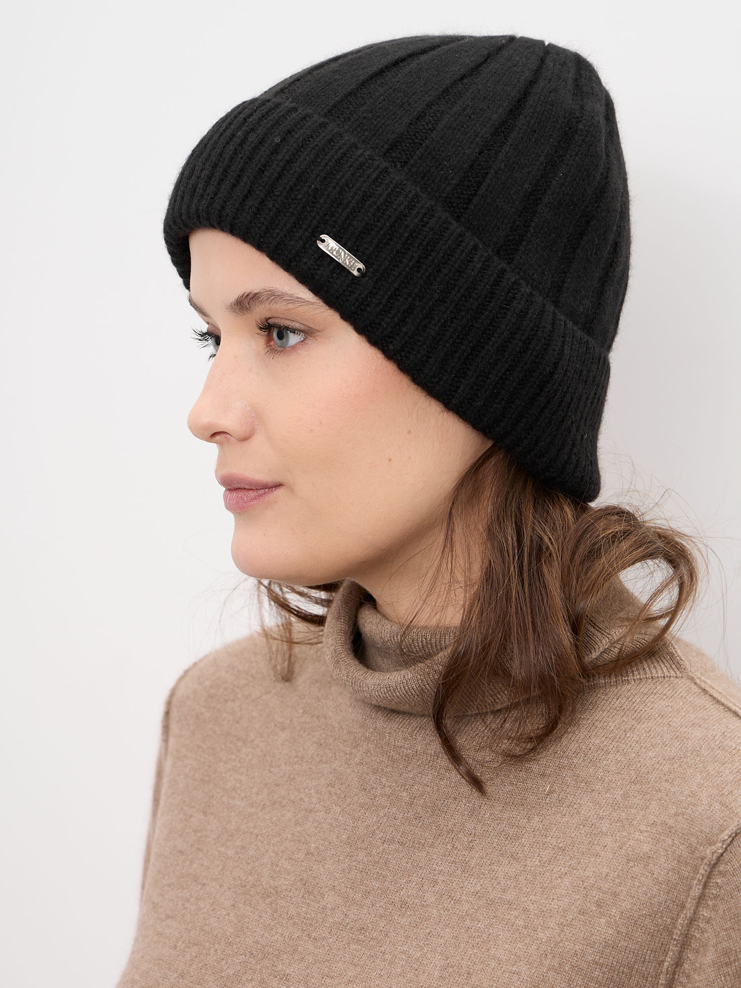 Однослойная шапка с эластичной вязкой, хорошо держит форму и мягко облегает голову. Минималистичный металлический логотип добавляет аккуратный акцент, не перегружая образ.
