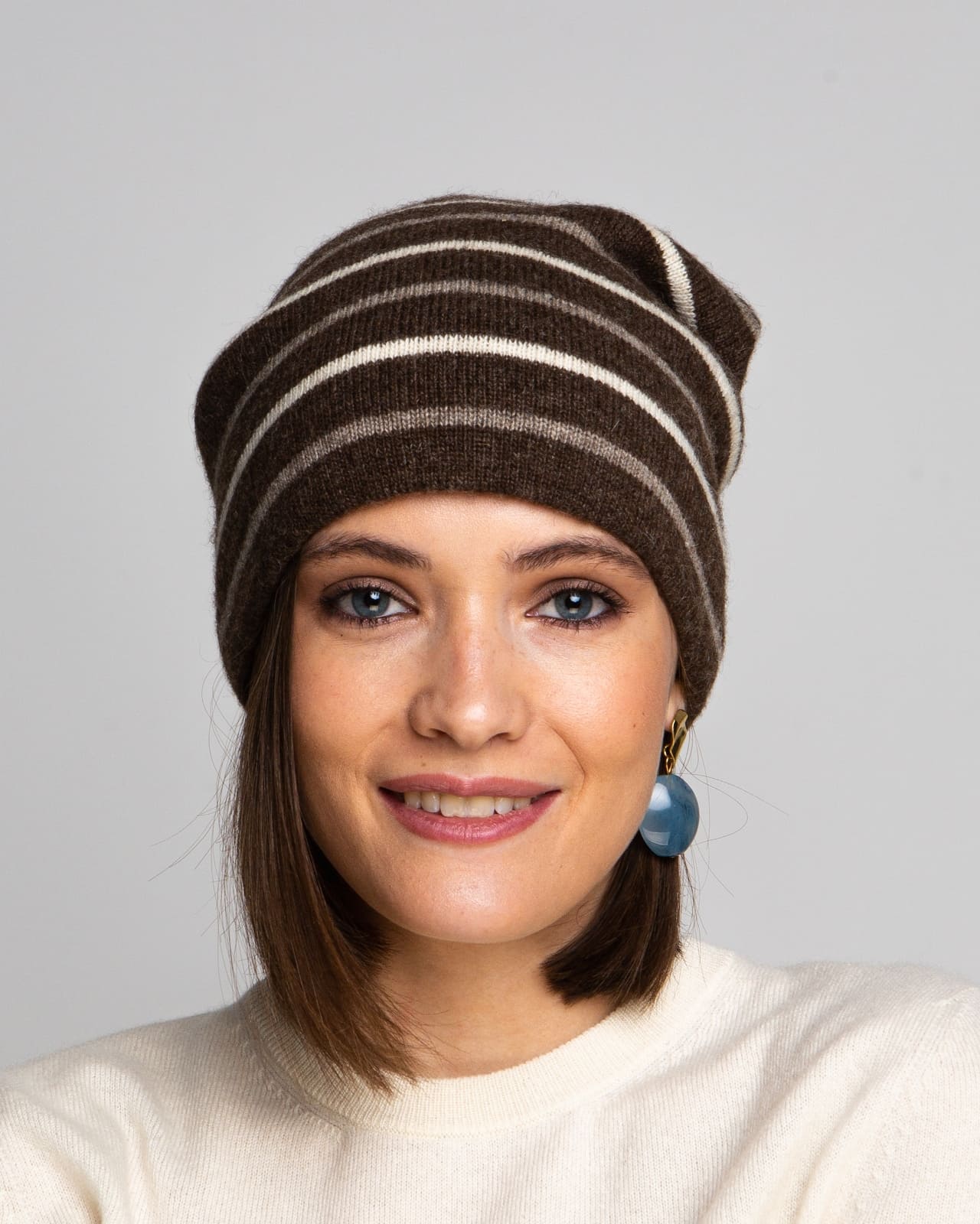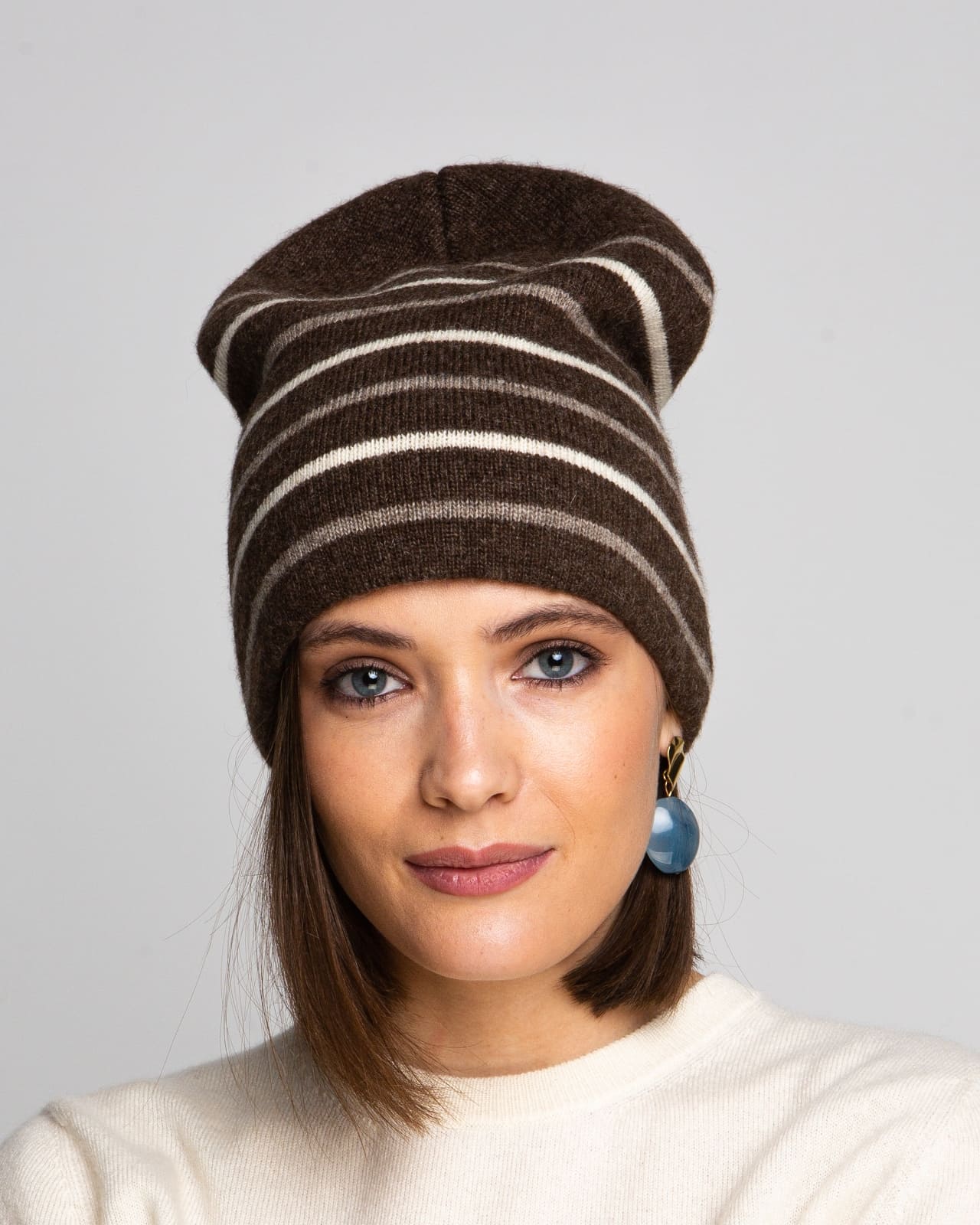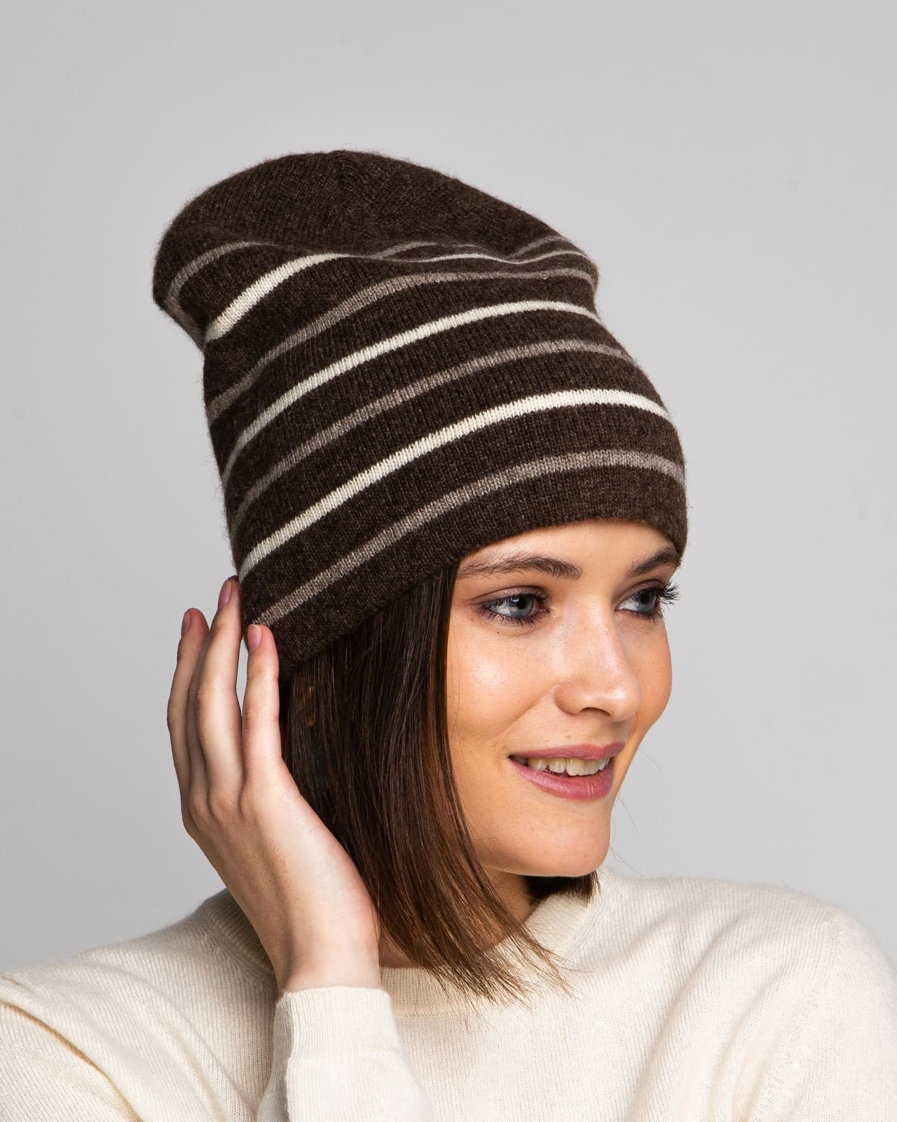 Шапка 7M11030 из шерсти яка — стильная модель с лаконичным дизайном и выразительным полосатым узором. Контрастные горизонтальные линии придают аксессуару динамичность и современный характер. Мягкая фактура и удлинённый силуэт делают шапку универсальным решением для повседневных образов в холодное время года.