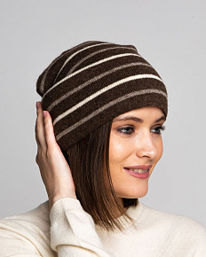 Красивая темно-коричневая шапка с полосками. которые ее очень украшают.