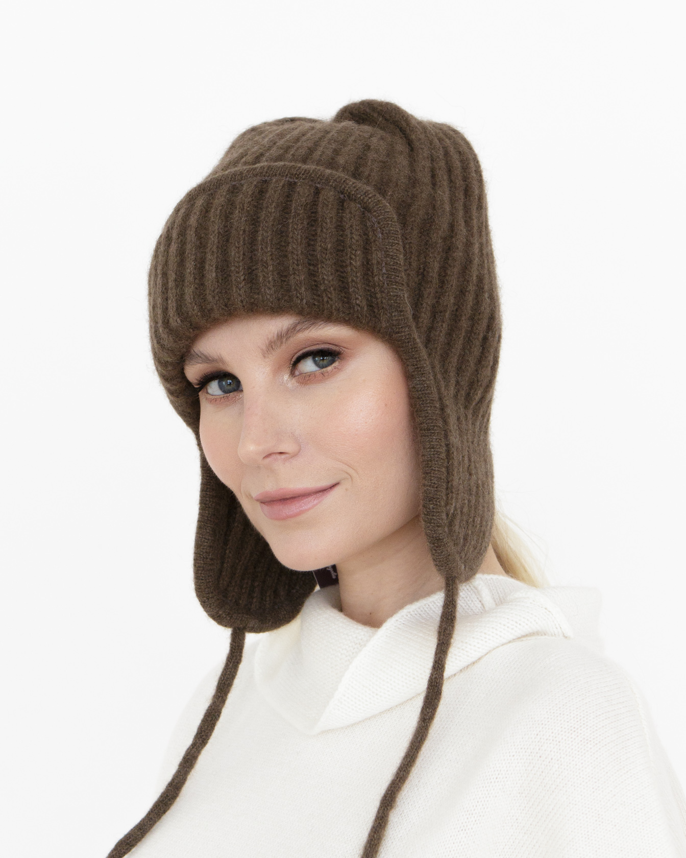 Классическая форма ушанки с удлинёнными ушами и завязками. Лаконичный коричневый оттенок легко сочетается с верхней одеждой в нейтральной и природной палитре.