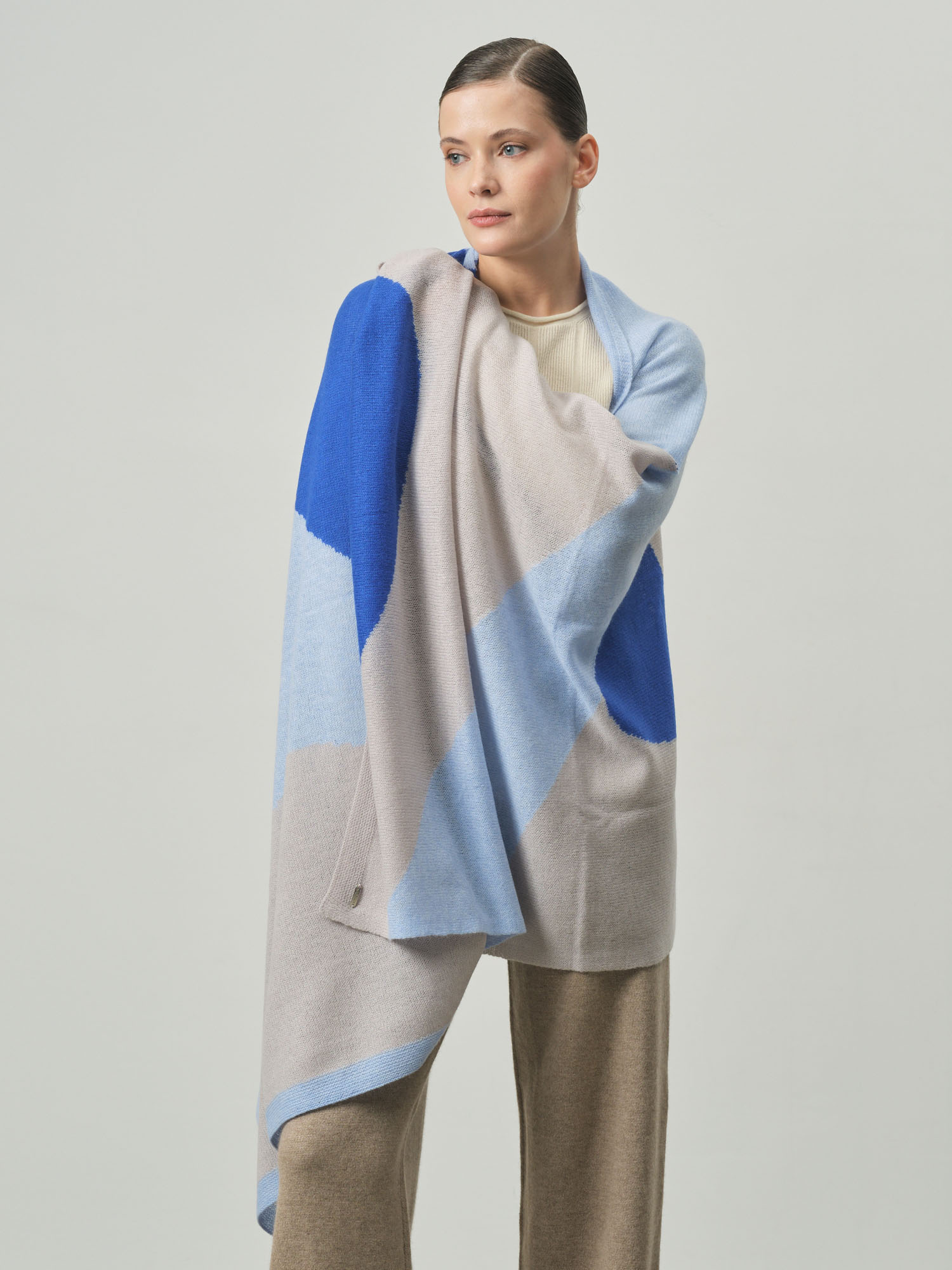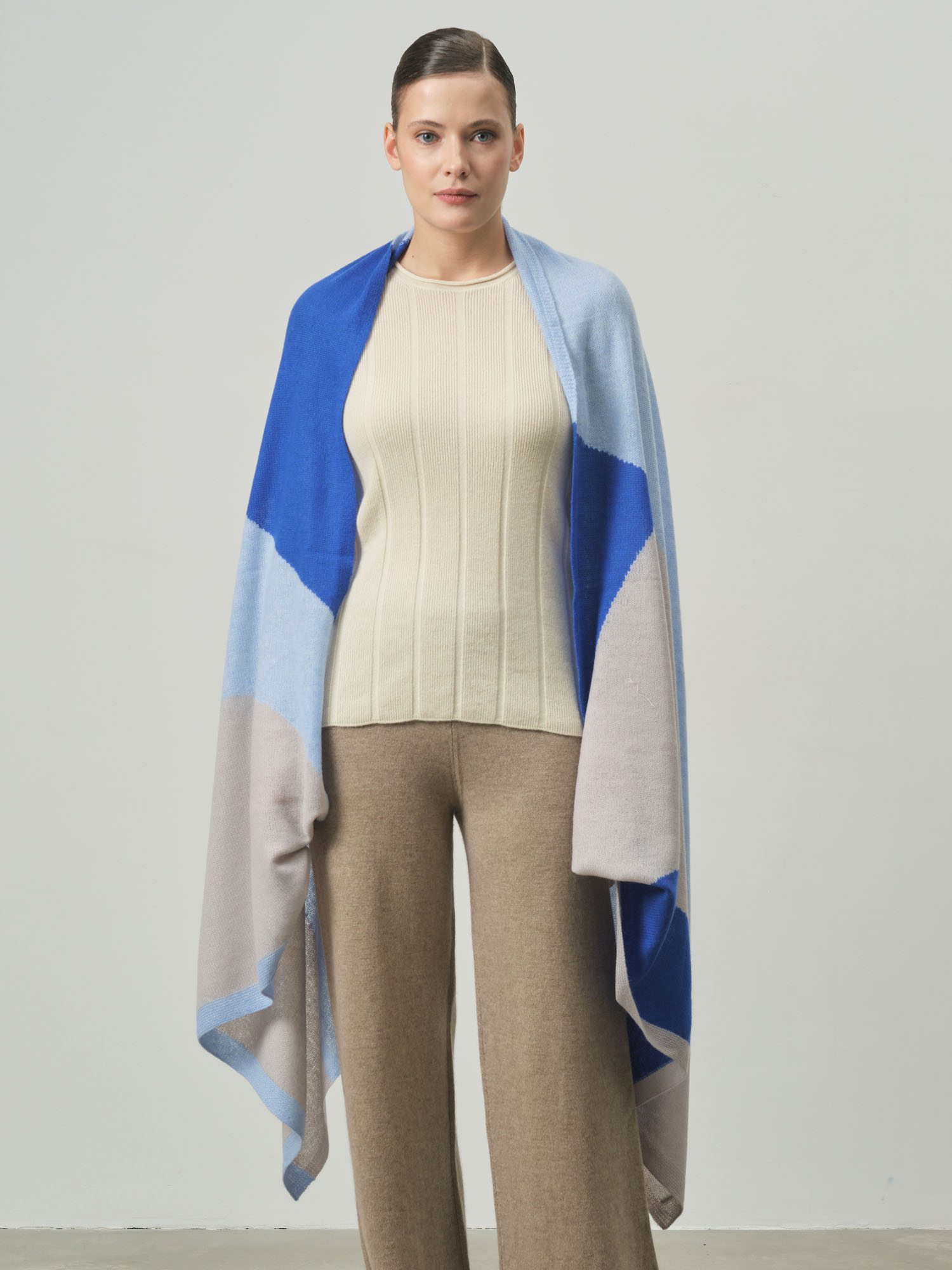 Безумно красивый цвет! Голубой оттенок очень нежный и освежающий. 100% кашемир потрясающего качества - мягкий, теплый, приятный к телу.