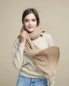 Палантин выполнен в классической прямоугольной форме с изящной ажурной вязкой. Фактурный узор придаёт изделию выразительность и визуальную лёгкость. Полотно мягко струится и образует аккуратные складки, создавая элегантную драпировку.