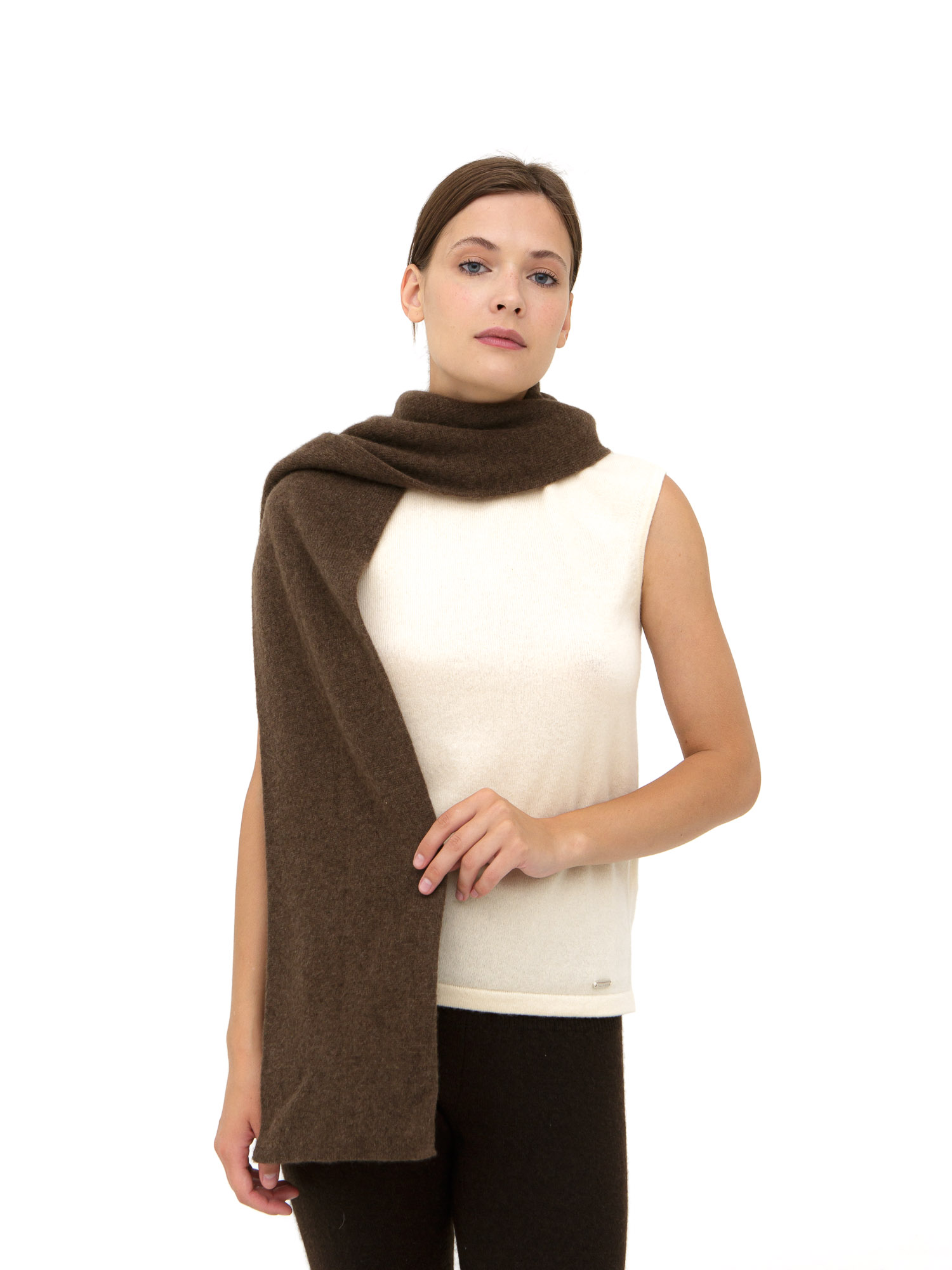 Классическая прямоугольная форма с лаконичной фактурной вязкой. Минималистичный дизайн подчёркивает натуральную текстуру материала и делает аксессуар универсальным для различных образов.