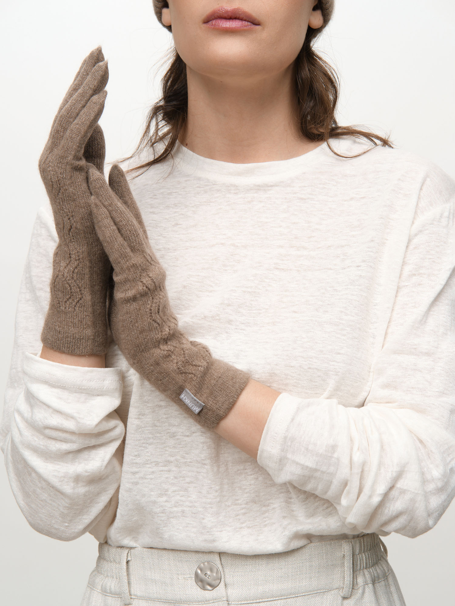 Ажурный вязаный узор придаёт модели утончённый и женственный характер. Аккуратная манжета обеспечивает комфортную фиксацию и завершает лаконичный, элегантный образ.