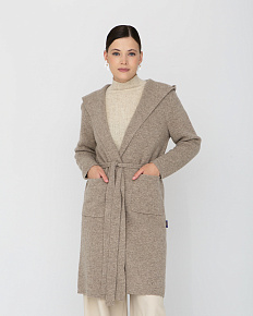 открытое пальто до колен с капюшоном и внешники карманами на поясе