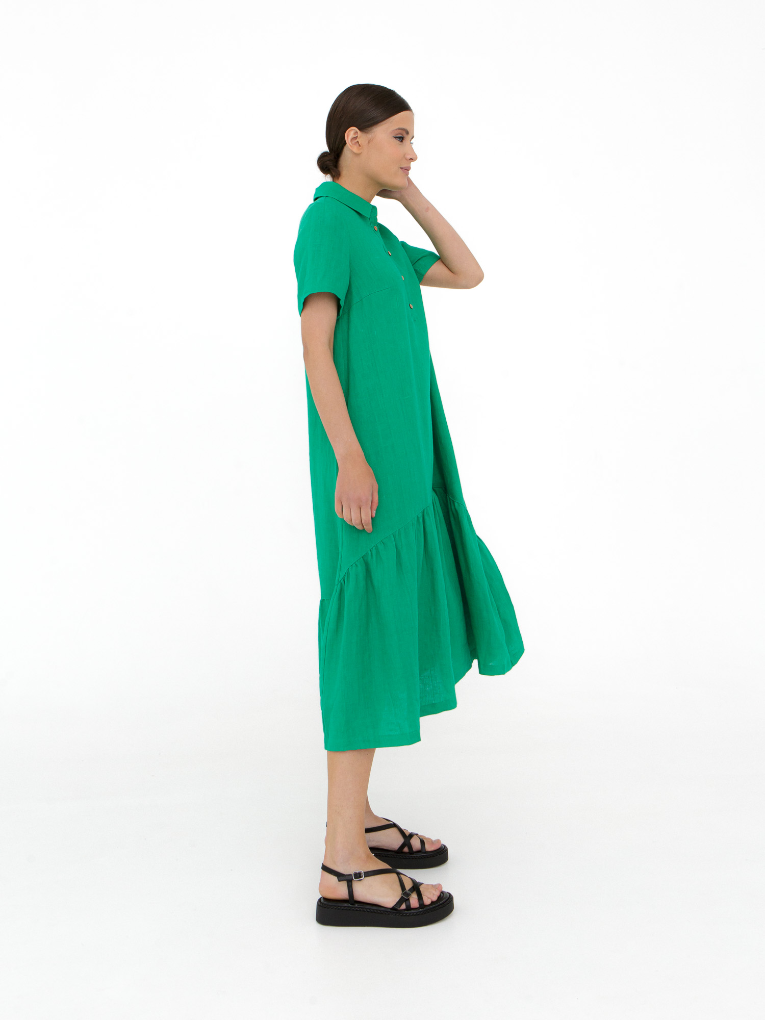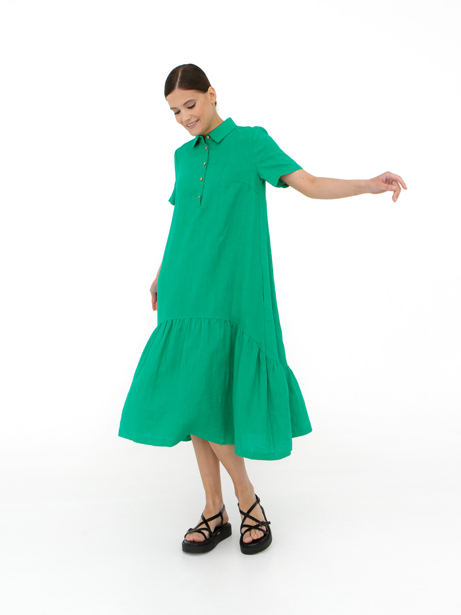 Платье выполнено в рубашечном стиле с прямым свободным кроем. Отложной воротник и застежка на пуговицы придают модели аккуратный и универсальный вид. Нижняя часть с присборенной юбкой добавляет объема и легкости, создавая динамичный и женственный силуэт.