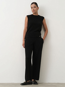 Эластичный пояс обеспечивает комфортную посадку, мягкая трикотажная вязка сохраняет форму изделия. Прямые брючины визуально вытягивают силуэт.