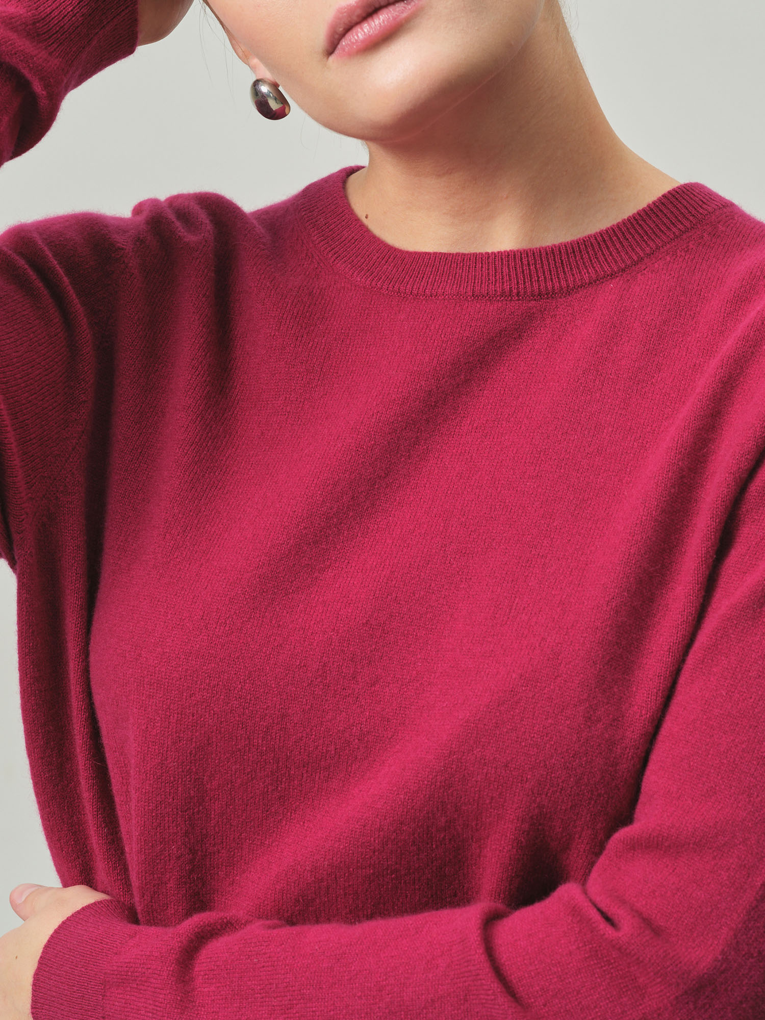 Богатый оттенок спелого баклажана добавляет образу глубину и изысканность. Этот цвет одинаково эффектно смотрится как в деловых ансамблях с юбкой-карандаш, так и в вечерних луках с шелковыми брюками или в повседневных сочетаниях с денимом. Умеренно приталенный силуэт с классическим круглым вырезом подчеркивает женственность, сохраняя при этом универсальность.