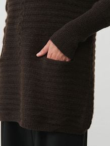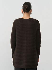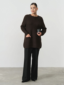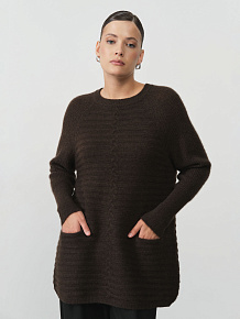 Модель выполнена в минималистичном стиле с круглой горловиной и длинными рукавами. Фактурная вязка придаёт изделию выразительность и подчёркивает натуральную текстуру материала.