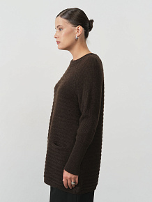Фактурная вязка по всей поверхности изделия, аккуратная трикотажная отделка горловины, манжет и низа. Практичные боковые карманы добавляют функциональности и удобства.