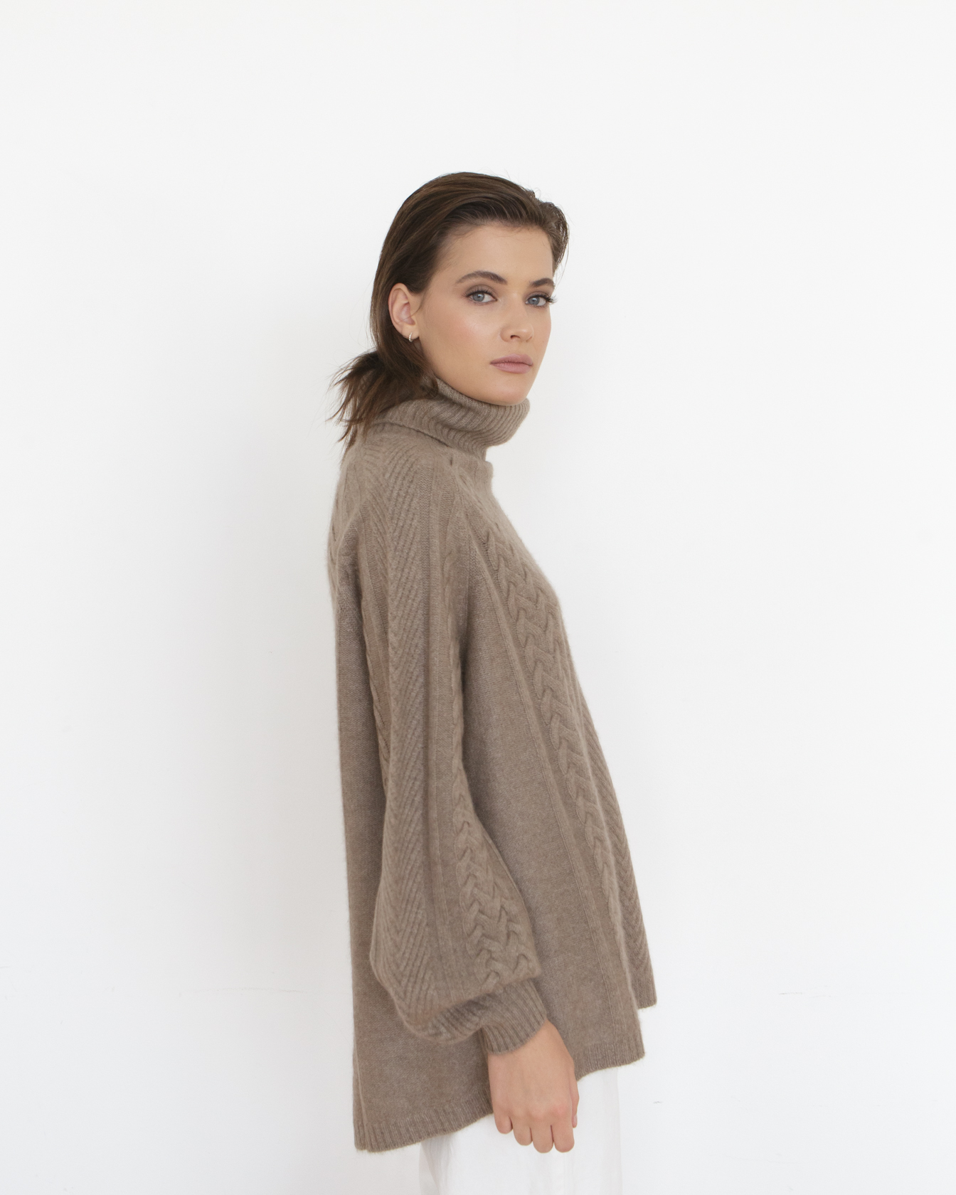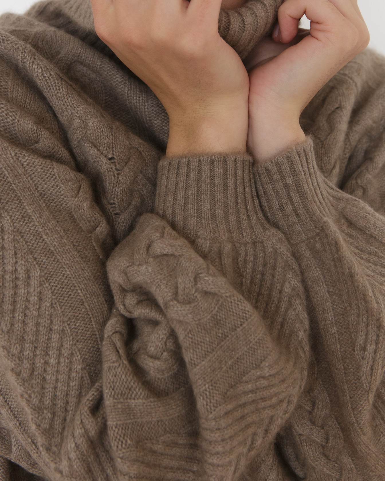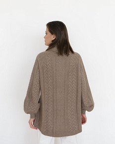 Модель выполнена с высоким воротником и объёмными рукавами. Фактурная вязка с вертикальными и косыми узорами придаёт изделию выразительность и подчёркивает благородную текстуру кашемира.