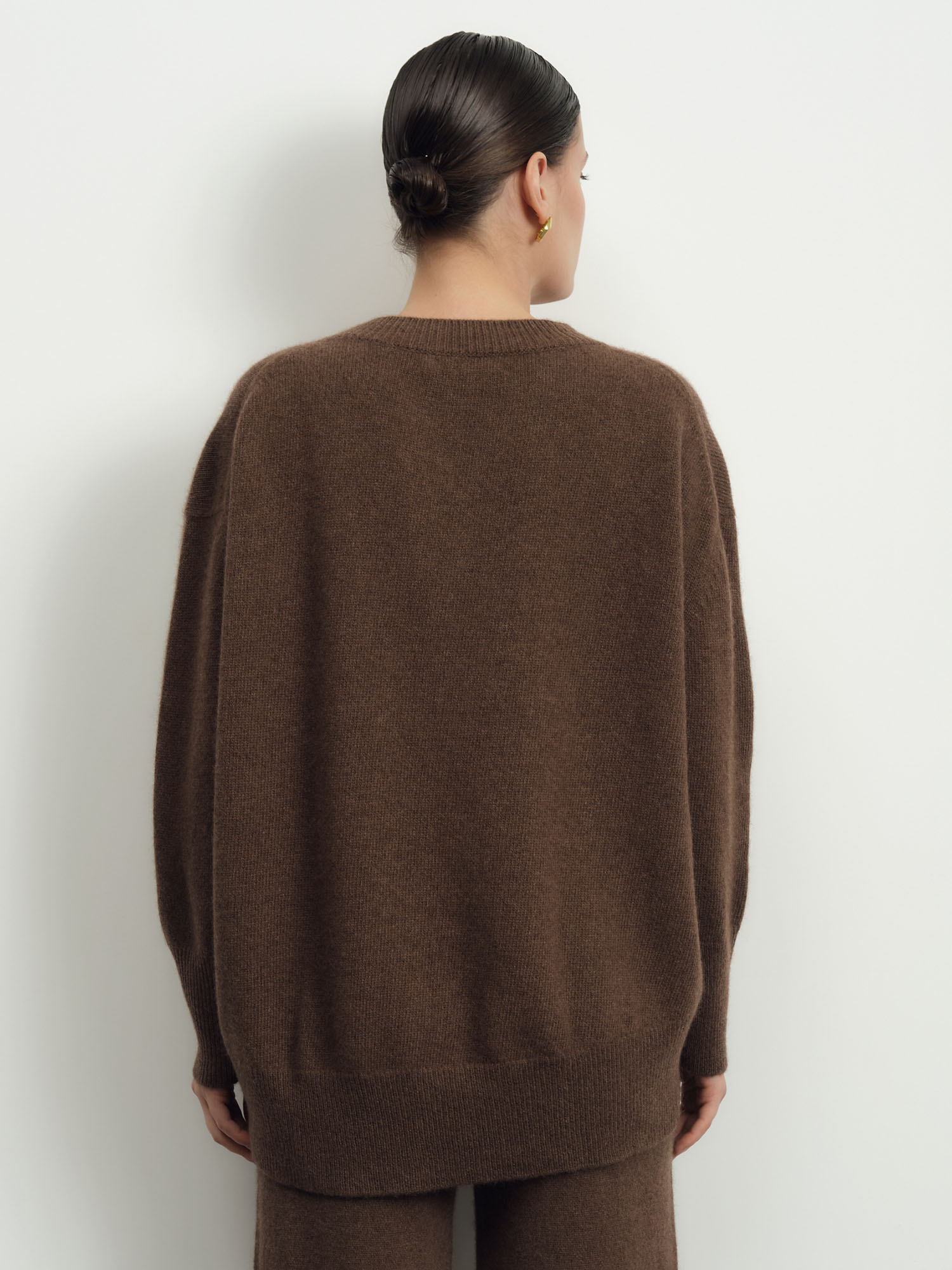 Модель выполнена в минималистичном стиле с круглой горловиной и гладкой вязкой. Прямой силуэт и лаконичные линии подчёркивают благородную фактуру натурального материала.