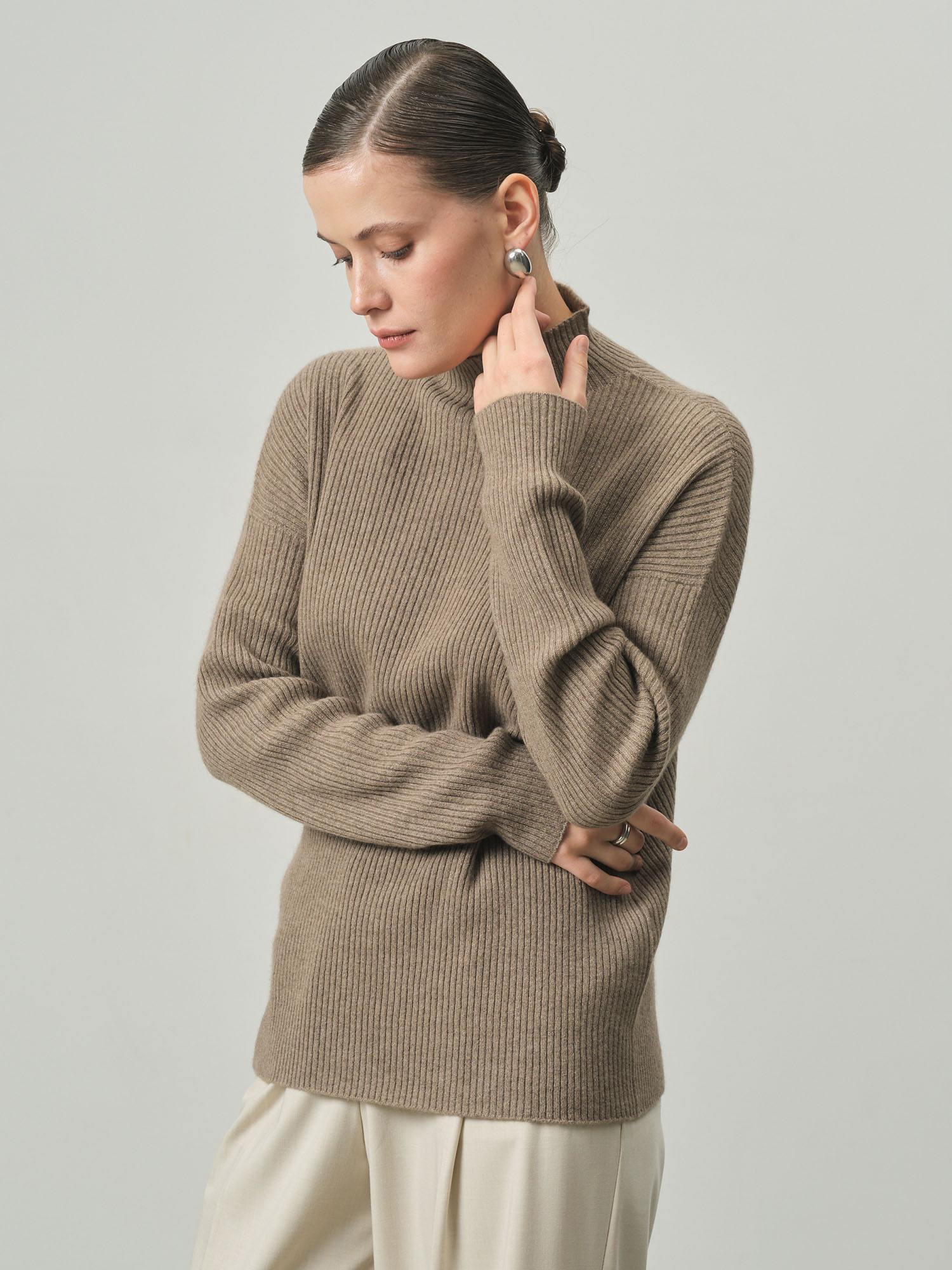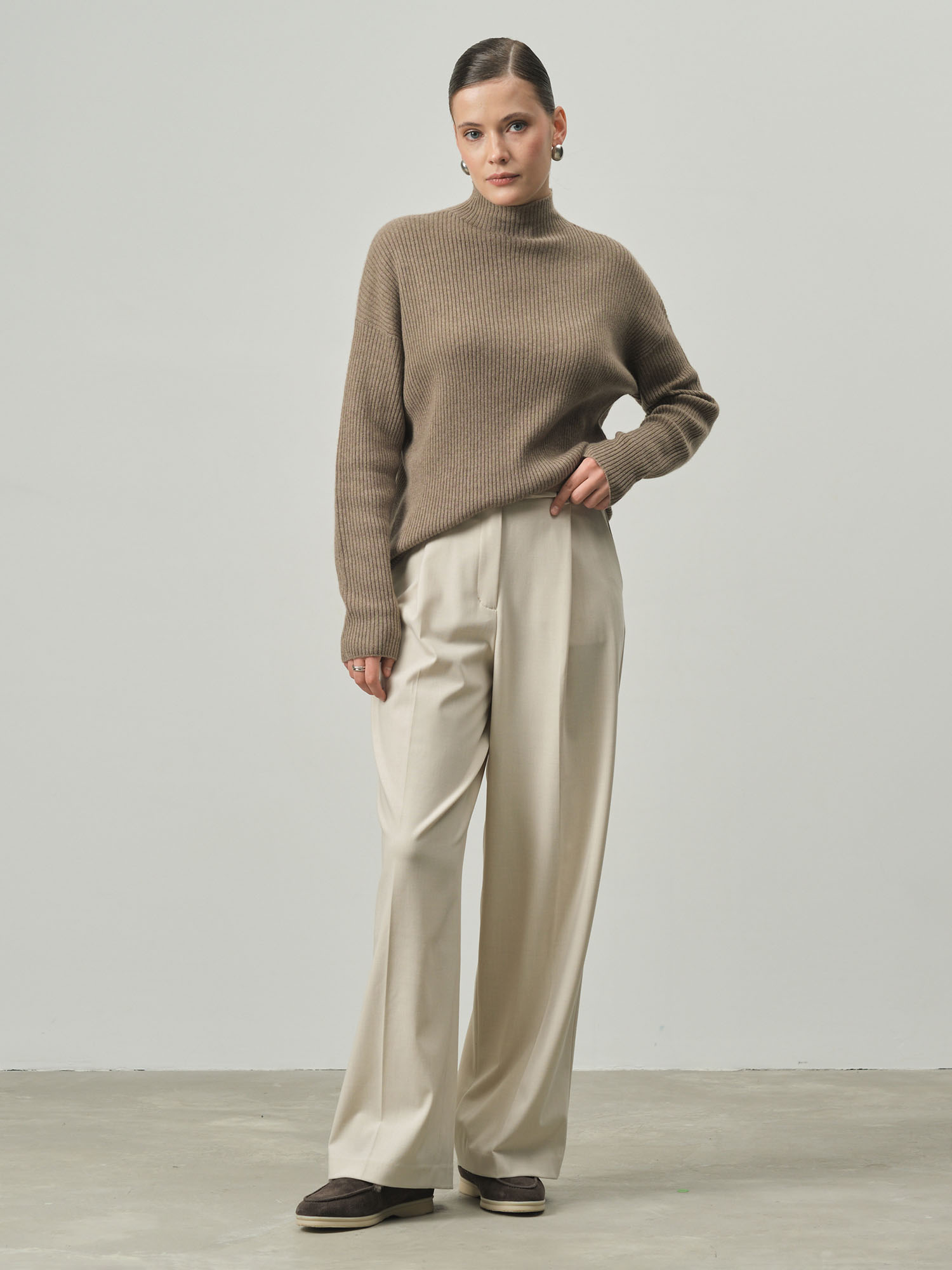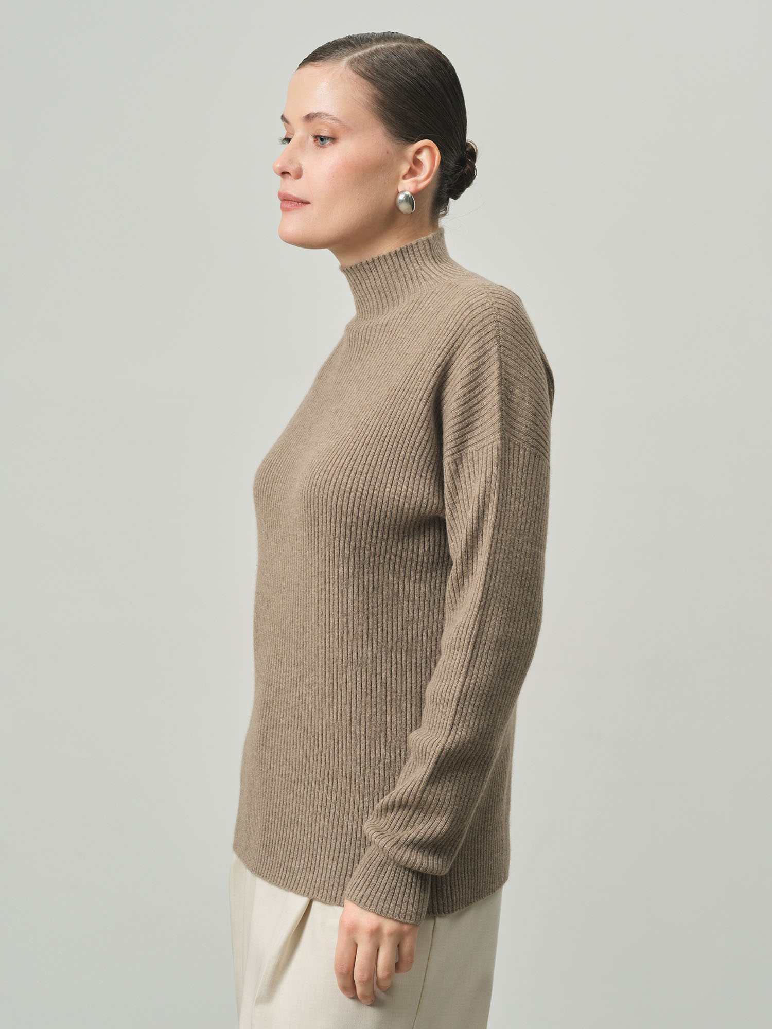 Модель выполнена в минималистичном стиле с аккуратным высоким воротником и гладкой вязкой. Чистые линии и простой силуэт подчёркивают благородную текстуру материала.
