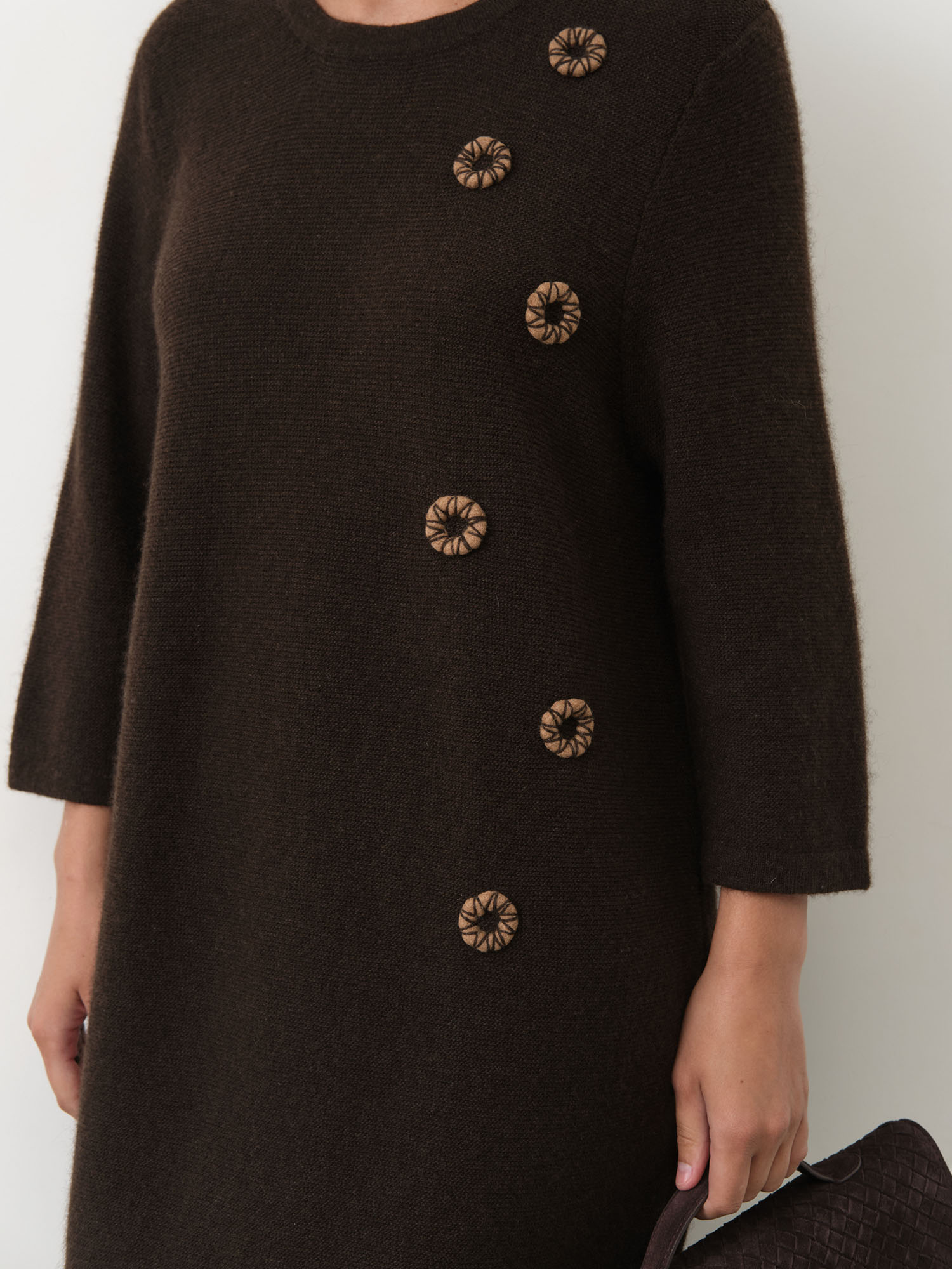 Модель выполнена в прямом силуэте с округлой горловиной и рукавами длиной 3/4. Лаконичный крой дополнен декоративными элементами, придающими изделию индивидуальность.